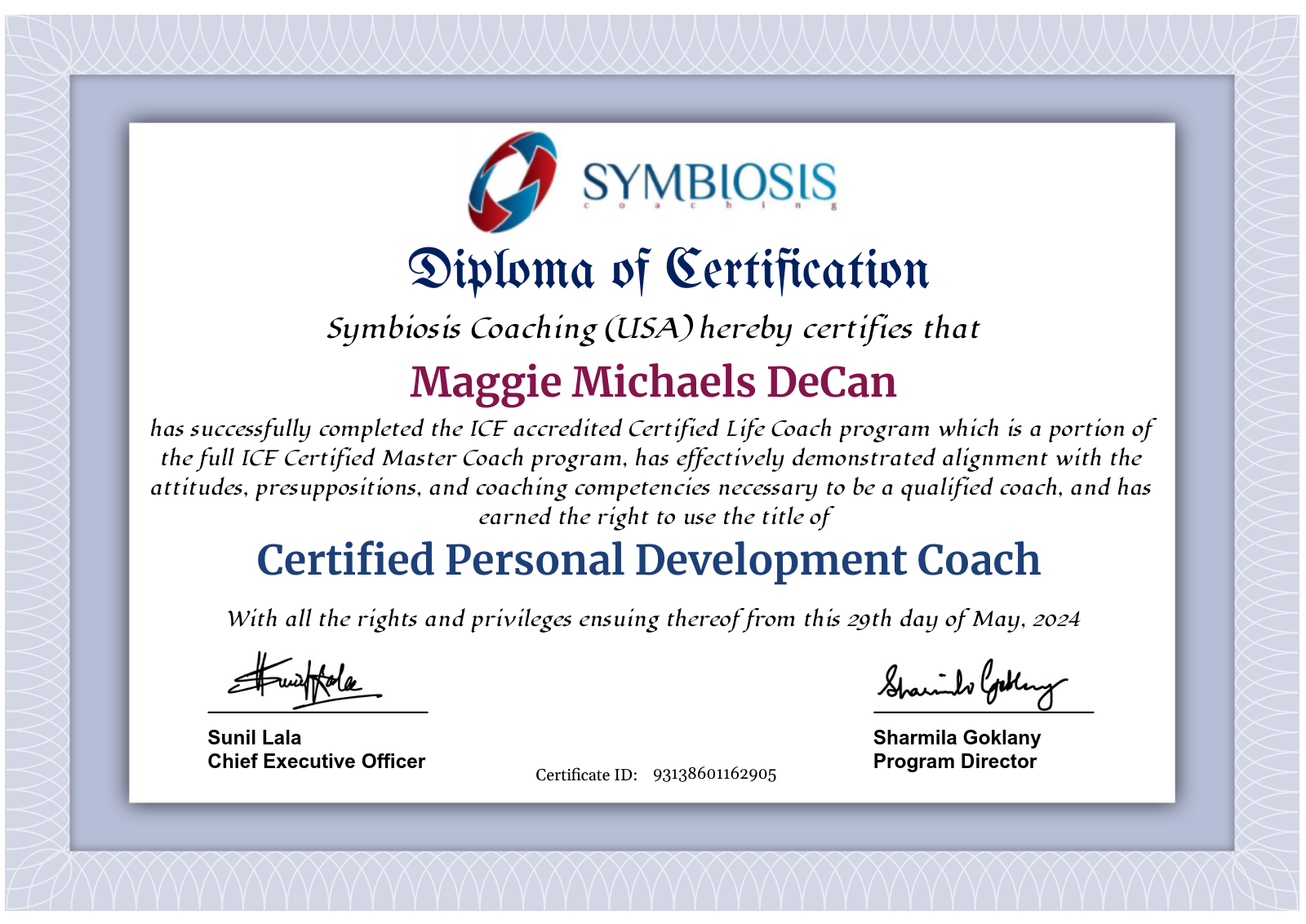 Discover personal growth and fulfillment with Maggie DeCan, a certified Life Coach. Maggie empowers individuals to navigate life's challenges and reach their fullest potential through personalized coaching to successfully identify their values and goal then write a lift plan with accountability. Define your life's pinnacle, then start the climb with a solid road map.